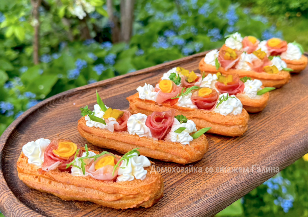 На праздничный стол идеально подходит закуска, которая объединяет красоту и вкус. Эта оригинальная идея включает в себя эклеры, наполненные прошутто, манго и руколой. Это не просто закуска — это кулинарное произведение искусства, способное удивить гостей.